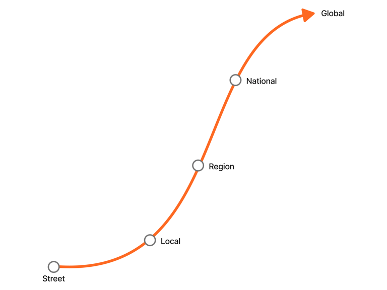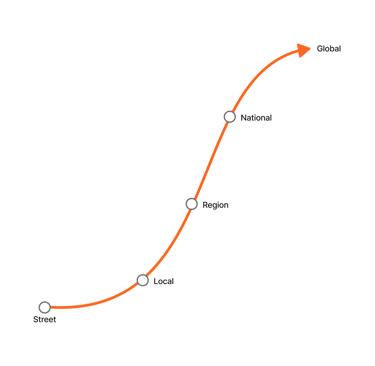 The next step is the local level, where social, cultural, and economic factors help your brand get noticed in your community.